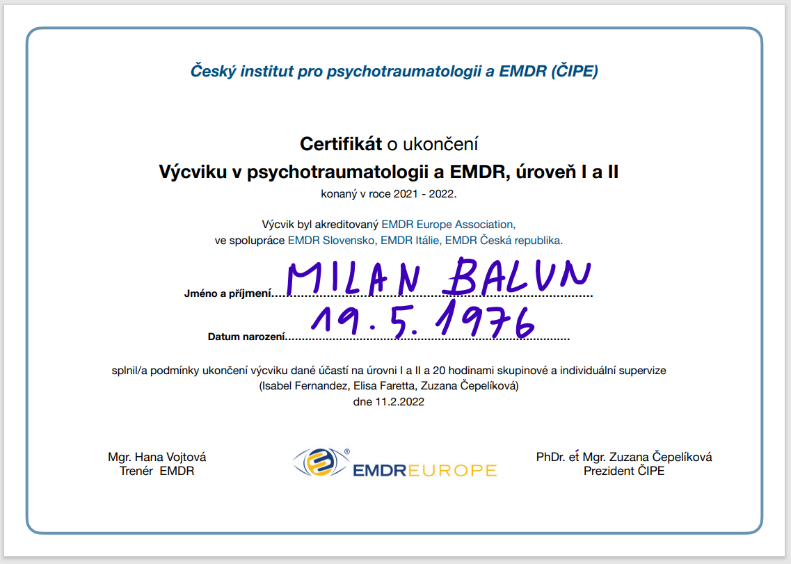 V roce 2021/22 jsem dokončil výcvik ve velmi účinné metodě pro zvládání traumatu a nepříjemných vzpomínek pomocí bilaterální stimulace mozku - EMDR, který prohloubil mé dosavadní znalosti a dovednosti v této oblasti. Aplikace této metody je dávána k uvážení dokonce i organizací WHO, pro lidí trpící PTSD - Posttraumatickou stresovou poruchou viz. WHO.