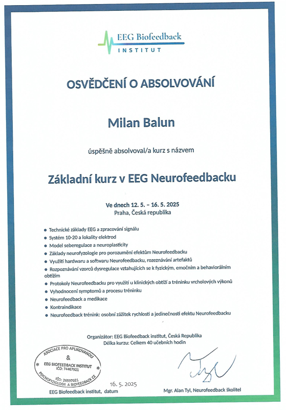 V roce 2025 jsem si rozšířil dovednosti ve zpracování traumatu, úzkostí a dalších psychických obtíží a to studiem EEG Neurofeedbacku v EEG Biodfeeback Institutu. Tuto metodu je možné využít také pro rozvoj koncentrace, zlepšení spánku a dalších obtíží spojených se stresem.